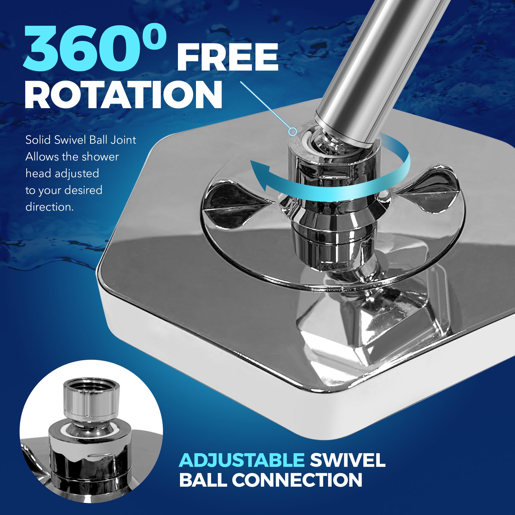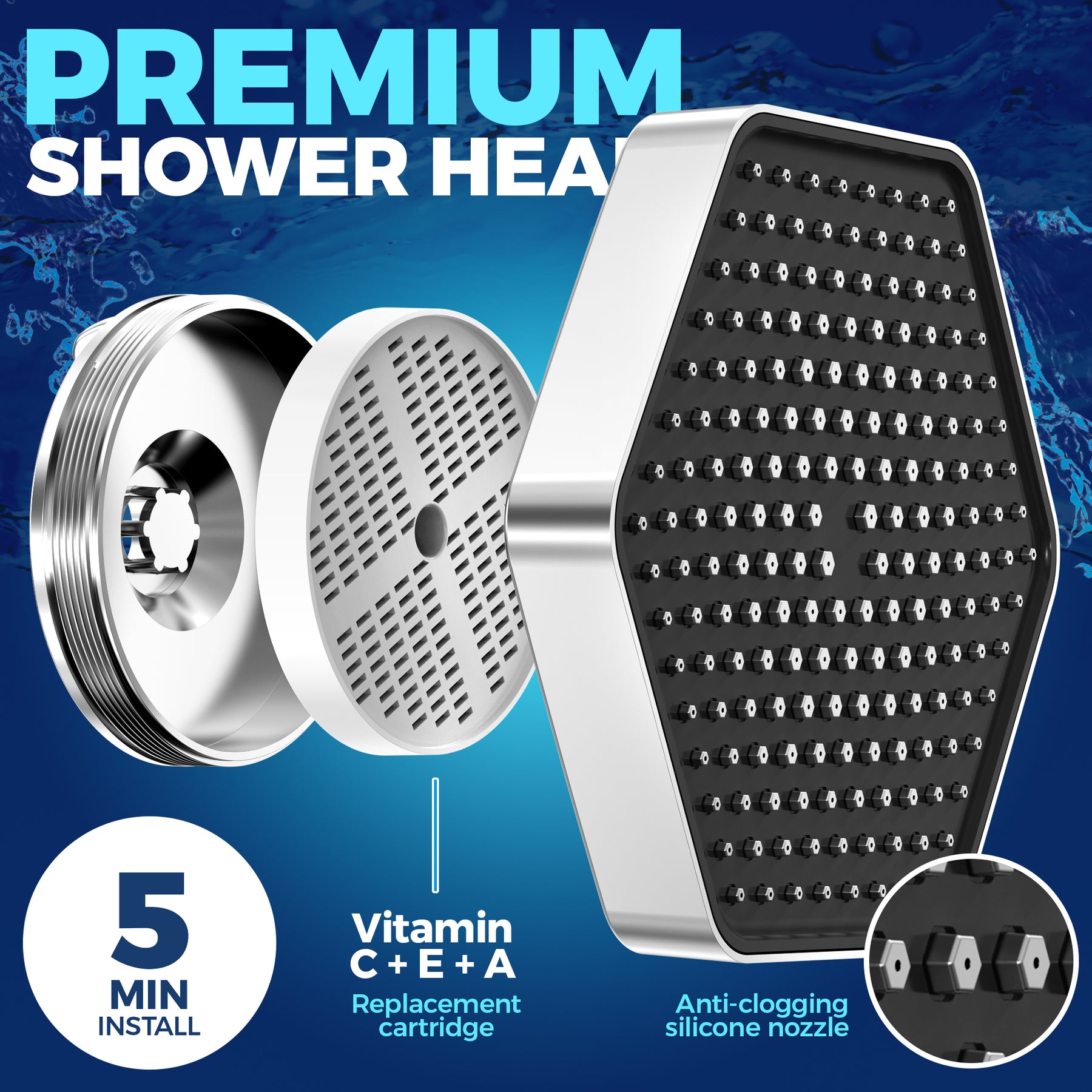 The universal filtered head shower 8-inch across hexagon shape that screws on to universal mount. The shower head filters to remove chlorine provide a spa, hotel, or massage feeling while being a water saver.