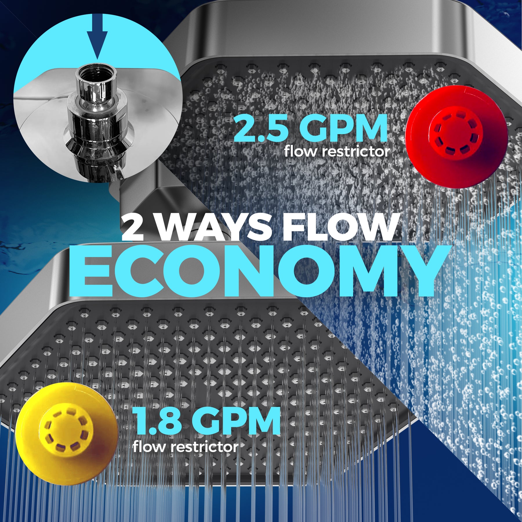 Package includes (1) showerhead, (1) 1.8 GPM flow restrictor, (1) 2.5 GPM flow restrictor, and (1) filter cartridge.